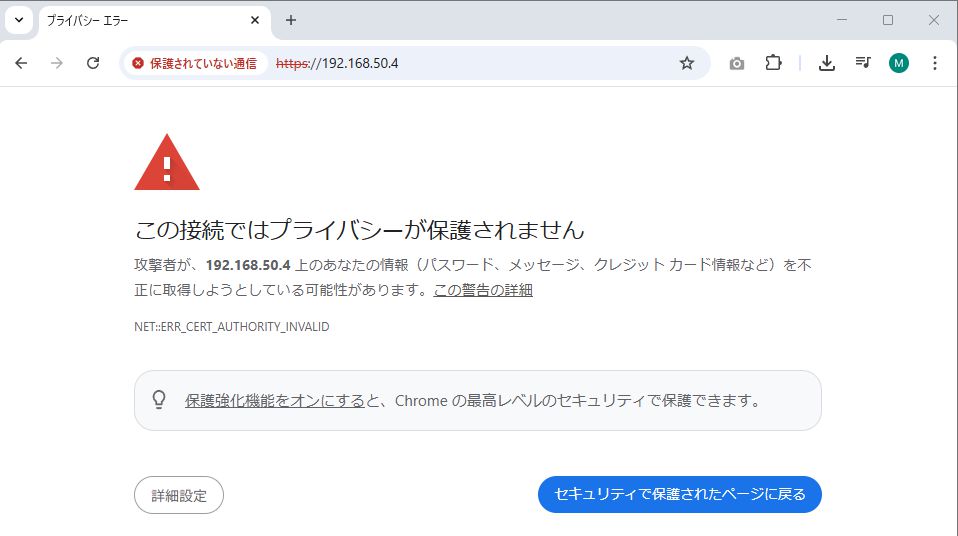 - LANを接続し、Webブラウザからアクセス(SSL証明書は無いので、最初は警告画面が出ますが、そのまま進めます)