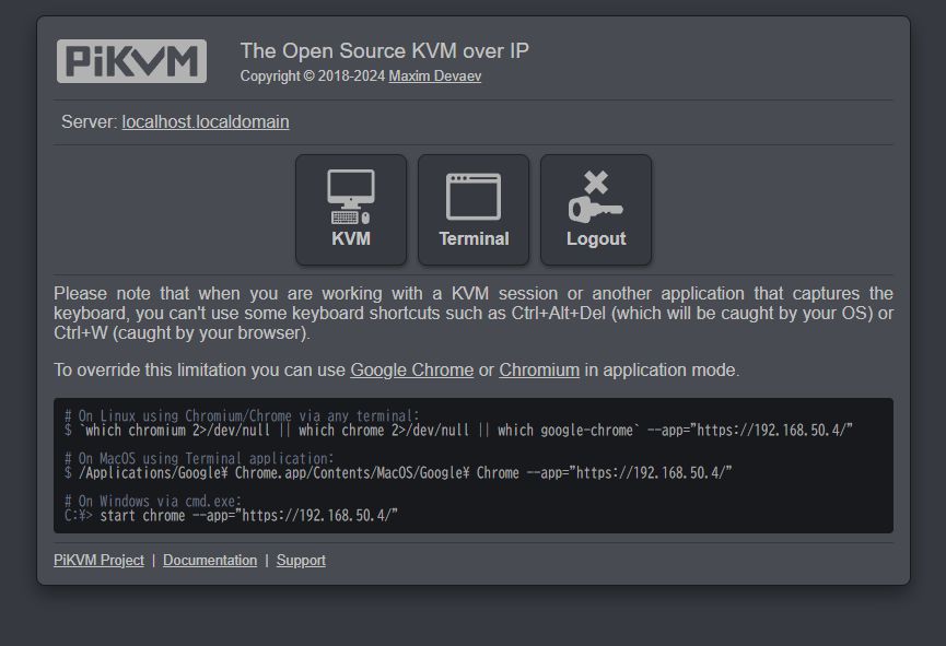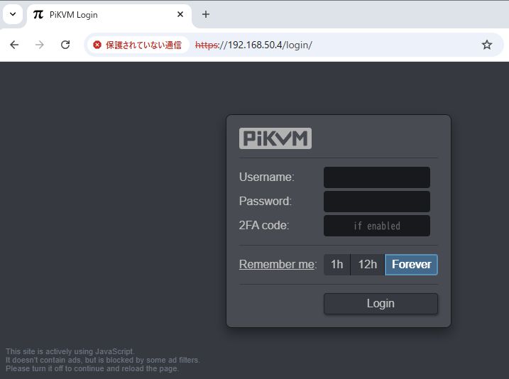 我が家の場合は「192.168.50.4」を固定IPで割り当て。 - PiKVMのWeb GUI画面が表示されるので、admin/adminでログイン。(外部からアクセス環境の場合、多要素認証設定もしておくと良いです)